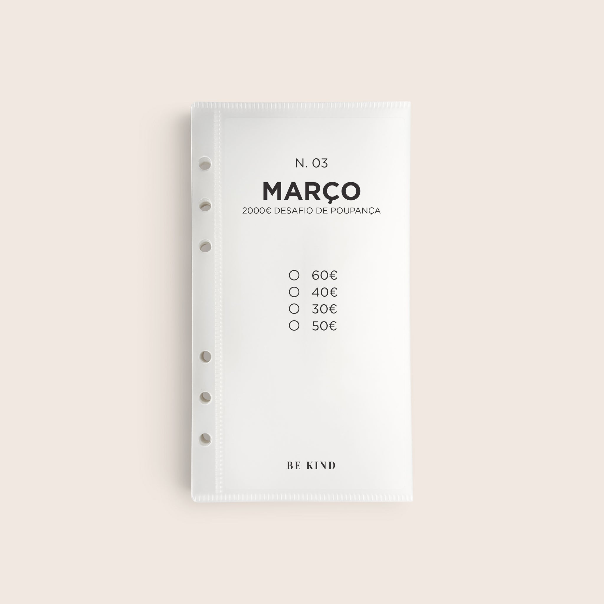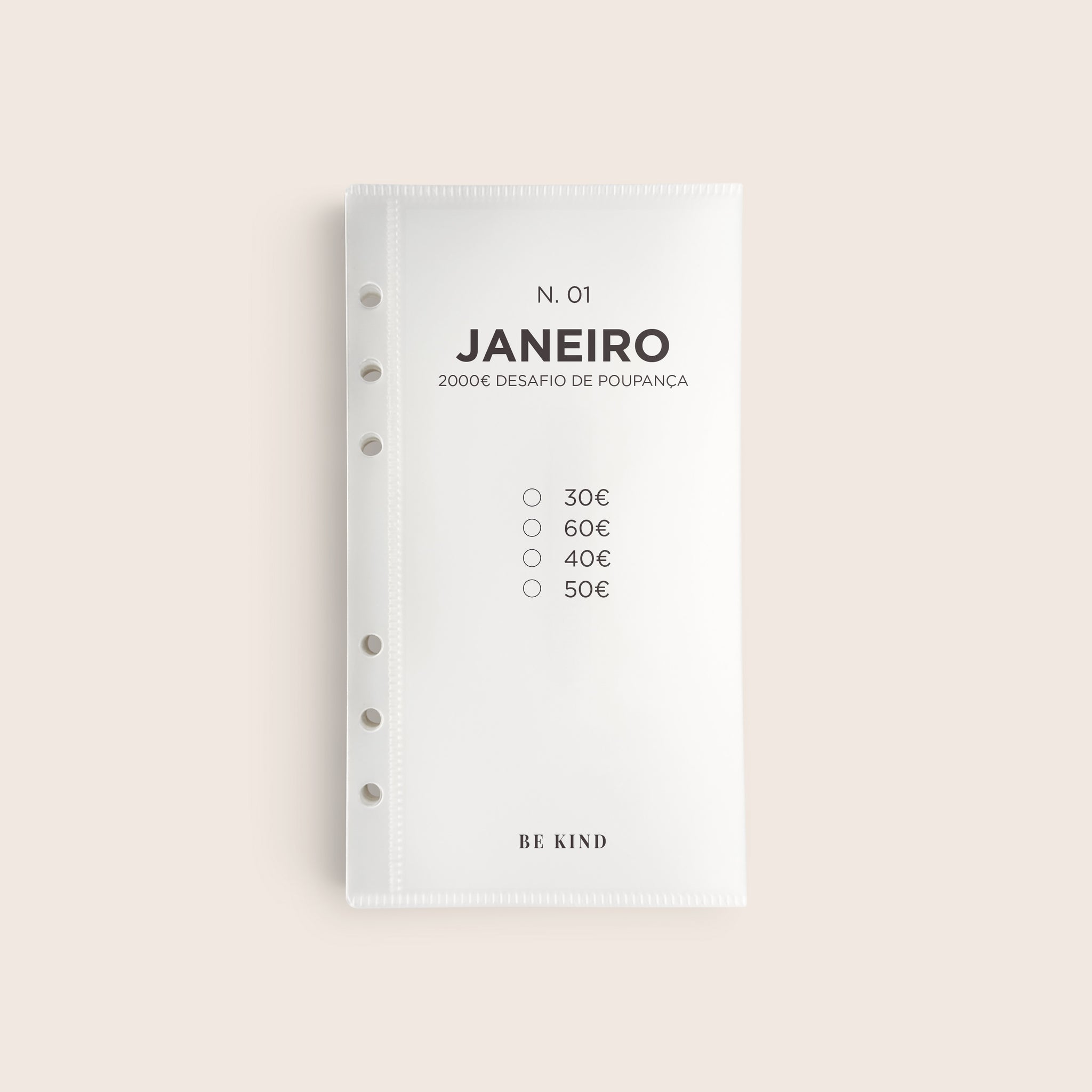 O desafio Mensal de 2000€ em 12 meses tem como objetivo uma poupança de 2000€ ao longo do ano. Cada mês inclui um tracker de poupança com quatro valores predefinidos, permitindo uma economia consistente.